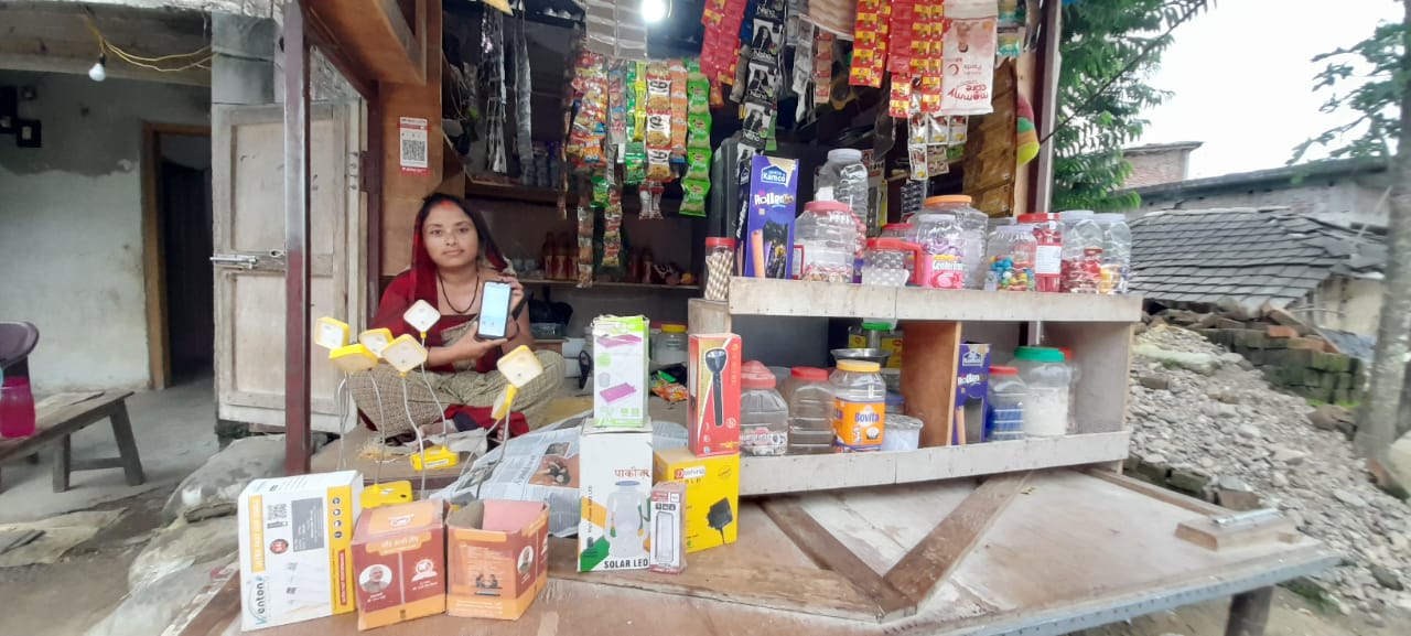 Basanti Devi, 24, comes from a low-income family in the village of Siswa Tajpur in Bihar. She runs a small business selling solar light bulbs. She uses Facebook, YouTube, and WhatsApp on her smartphone for her business. Phulwanti Devi, her trainer has introduced her to the MeraBills app so that she can record all her transactions.