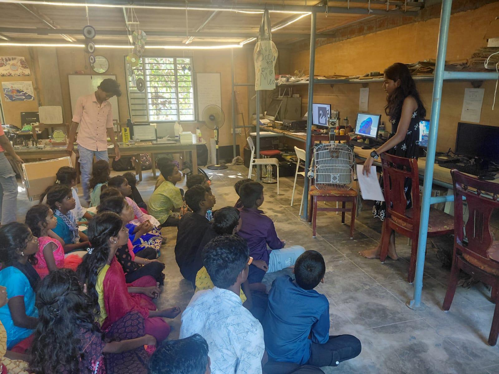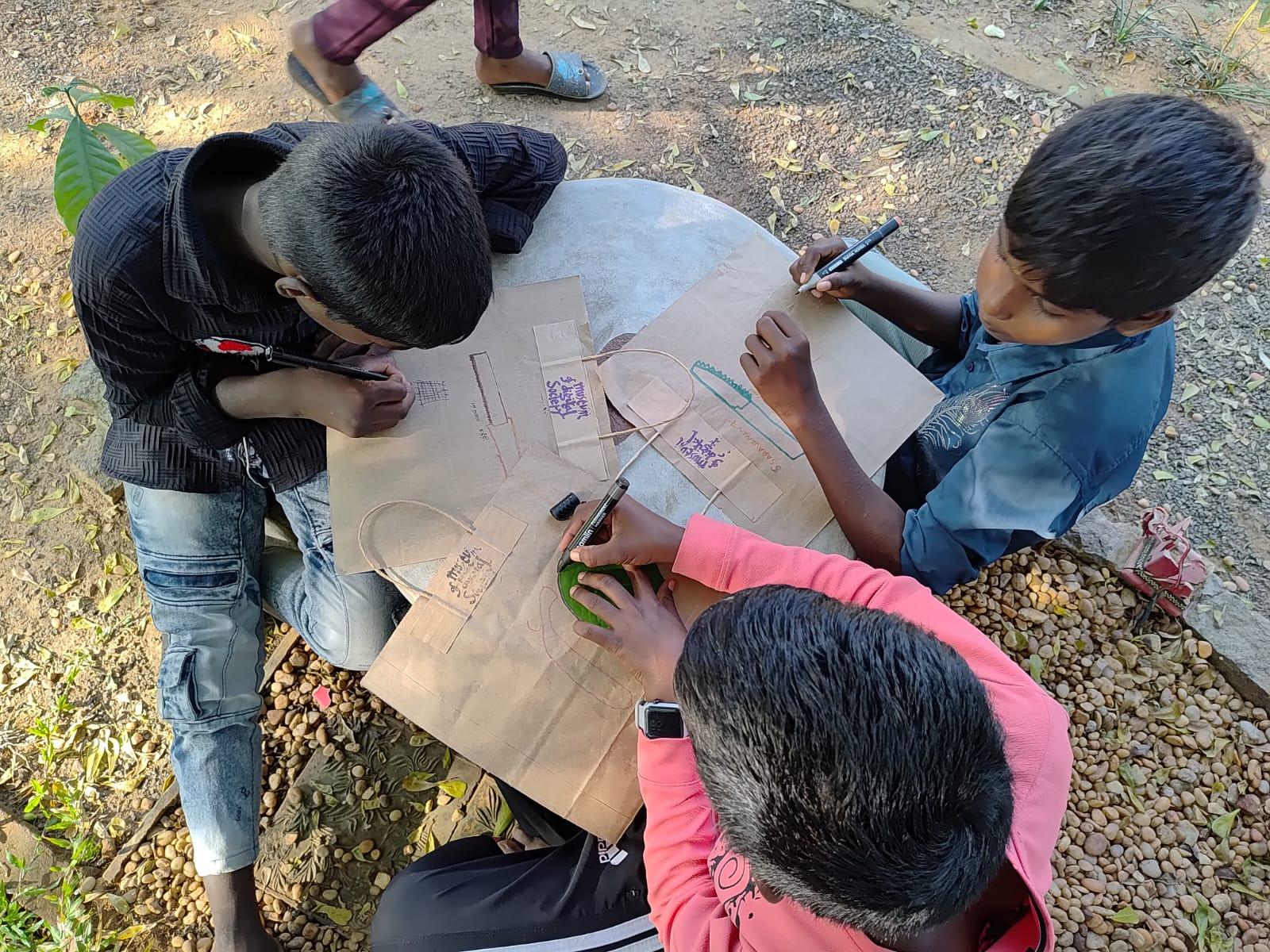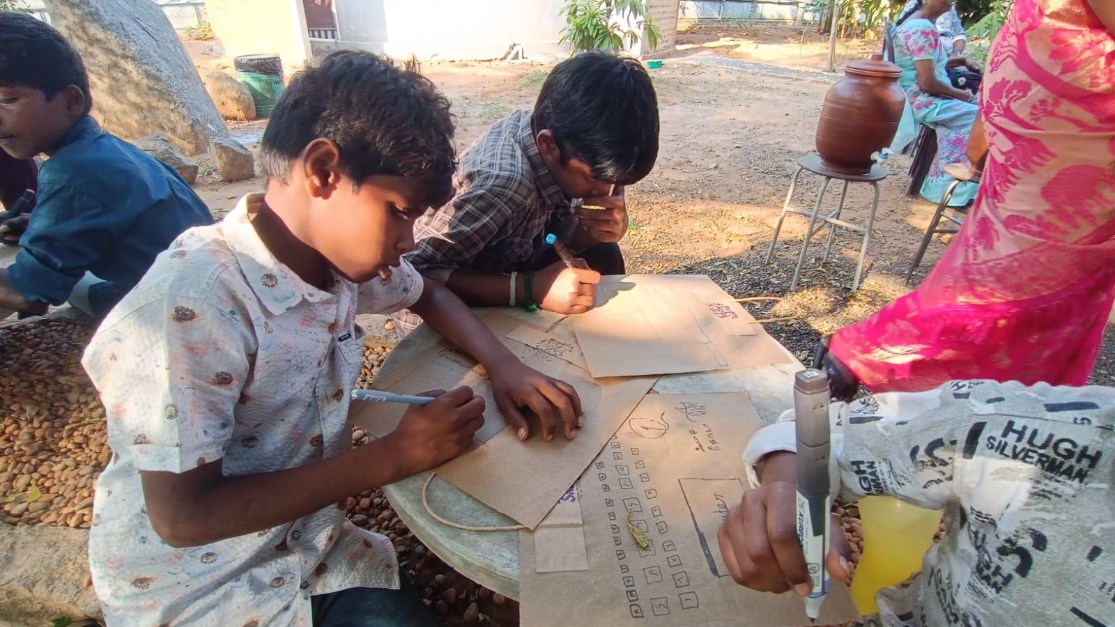The workshop began with a creative attendance activity that set the tone for the rest of the day. Instead of a conventional roll call, each student was handed a postcard made from reused paper bags. Students were asked to write their names, villages, ambitions, and hobbies on the postcards. The exercise was bilingual, allowing students to express themselves in either Tamil or English. Given that the school’s medium of instruction is Tamil, it was particularly encouraging to see a significant number of students choose to write in English, reflecting a quiet confidence in stepping beyond their comfort zone.